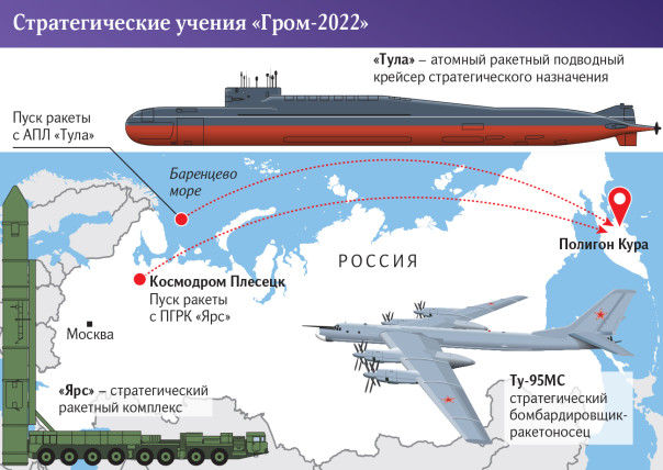 К стратегическим учениям «Гром-2022» привлекаются все компоненты российской ядерной триады: ракетные войска стратегического назначения, подводные силы и дальняя авиация.