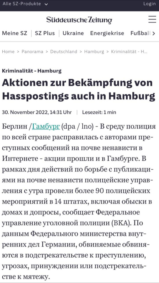 Вчера полицейские штурмовали более 90 квартир в 14 федеральных землях. Предлог: граждане критиковали правительство в Интернете, обвинения сводились к оскорблениям (со стороны политиков), клевете и подстрекательству к мятежу.