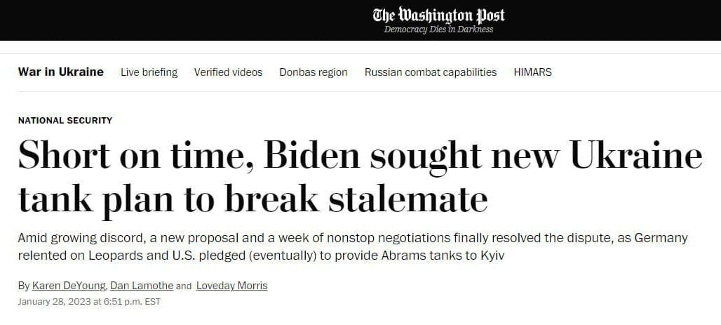 Прежде всего, вскрылся обман госсекретаря Блинкена относительно «долгосрочных потребностей». Уже несколько таблоидов опубликовали слова экспертов о том, что обещания США насчёт танков были сделаны с единственной целью: чтобы Германия первая поставила свои «Леопарды», а Вашингтон торопиться не будет. «Абрамсы», если появятся, то лишь в конце 2023 года, а то и в начале следующего.
