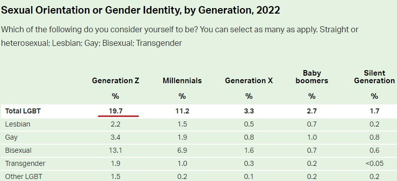 Поступили новые данные от Гэллапа по размеру популяции содомитов и трансов в США, она осталась практически на прежнем уровне - 7,2%, против 7,1% в прошлом году. Все иные показатели тоже почти одинаковые, в том числе по молодёжи, а среди неё первертов 20%.