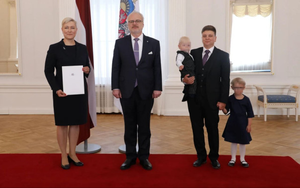 На фото с президентом Латвии Эгилом Левитсом - теперь официальный муж Катрина Кактиня с детьми, и поделившаяся в твиттере радостью с общественностью жена, Агнесе Калниня, - с аккредитационным письмом.