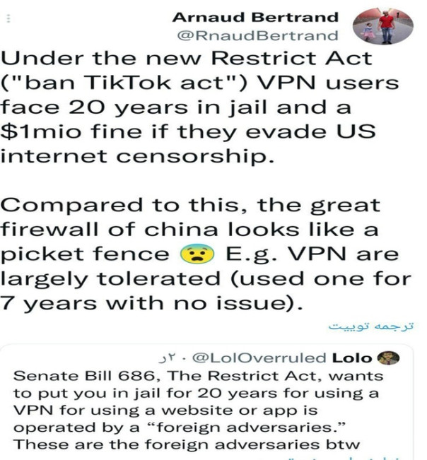 «За размытыми формулировками скрывается ухмылка Большого брата. В законопроекте говорится, что министру торговли будет предоставлен ряд инструментов вплоть до запрета технологий, которые могут нанести ущерб США. Речь, например, может идти об угрозе выборам. Ещё более абстрактный смысл вложен в понятие “транзакция”. Под это можно подвести абсолютно любую операцию с использованием любого неугодного продукта в сфере IT. Зато срок более чем реальный. До 20 лет тюрьмы. Да хоть за то, что выступаешь против войны с Россией», – пишет Валентин Богданов, шеф бюро ВГТРК в Нью-Йорке.