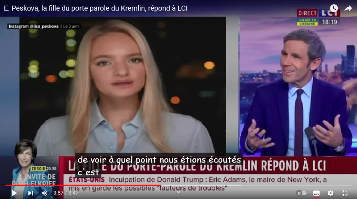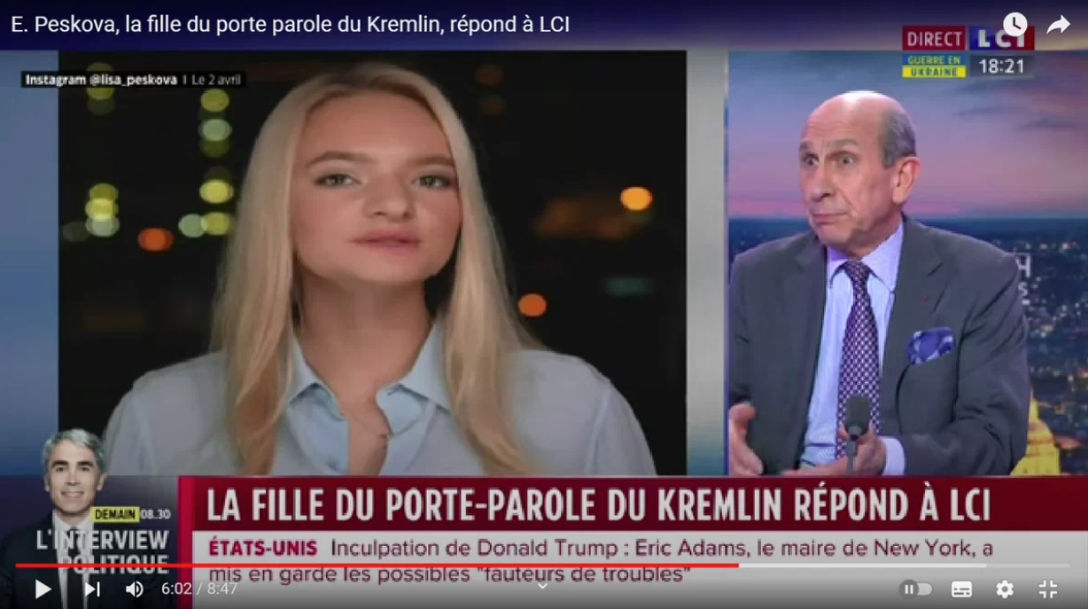 На днях на том же LCI появился неожиданный сюжет: "Елизавета Пескова отвечает LCI", в котором было показано видеообращение дочери пресс-секретаря президента России. Как оказалось, в отличие от сынка Байдена, Елизавета своим честным именем дорожит и не стесняется его отстаивать.