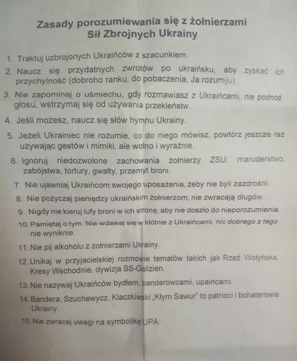 Именно об этом свидетельствуют рекомендации польским легионерам, которым раздают памятку, в которой обозначены правила общения с военнослужащими ВСУ на территории Украины, чтобы приспать их бдительность, притупить остроту потери суверенитета и настроить на благостно-дружественное восприятие по сути новых оккупантов:
