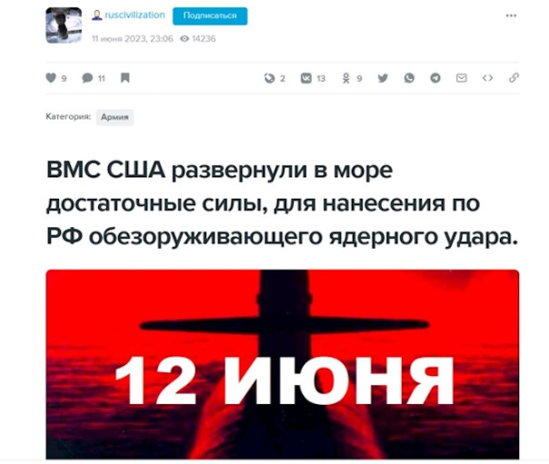 «В понедельник, 12 июня мы сможем наблюдать совершенно уникальное явление. США и НАТО совершенно хладнокровно и буднично развёртывают группировку сил и средств, достаточных для внезапного обезоруживающего ядерного удара по нашей стране.