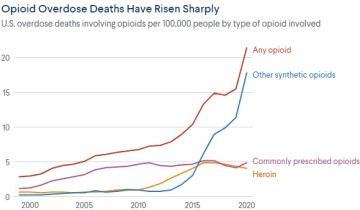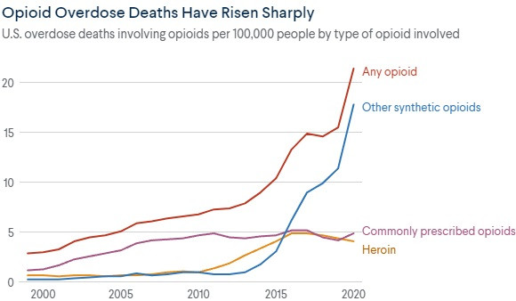 В США число передозировок наркотиками за последние 20 лет выросло в 5 раз: опиодиды (все виды) – 7 раз, синтетические опиоиды (в основном фентанил) – 60 раз, рецептурные опиоидные обезболивающие – 4 раза, героин – 6 раз. Примерно то же происходит в Канаде, где в последние годы смертность от передозировок опиодидами подскочила в более чем два раза: 2016 год – 2,9 тыс., 2020 – 6,3 тыс.
