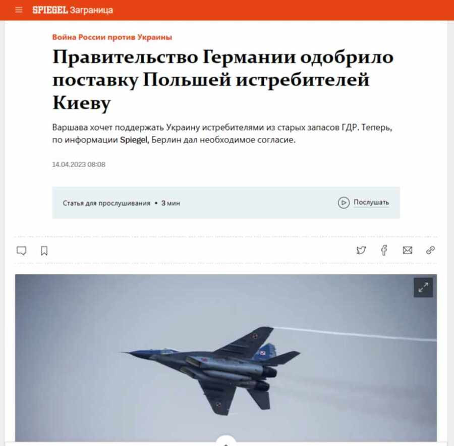 «Правительство Германии разрешило Польше передать Украине истребители советского производства, полученные Варшавой из запасов бывшей ГДР. Речь идет о пяти истребителях из запасов бывшей ГДР….В 2002 году федеративная республика продала Польше 23 МиГ-29 из запасов бывшей ГДР. По данным польской стороны, сейчас она располагает «примерно дюжиной» таких истребителей.»