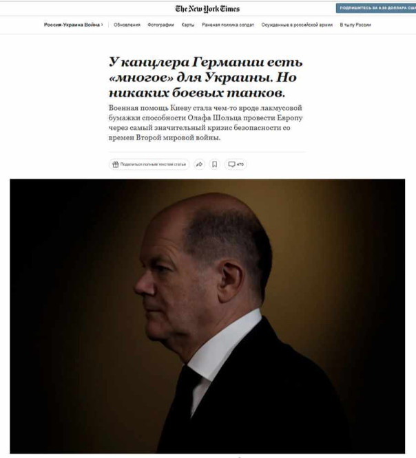 «Но г-н Шольц отказался предоставить Украине боевые танки Leopard или боевые машины пехоты Marder, о чем неоднократно просили украинские официальные лица. …Отказ г-на Шольца, который идет вразрез с волей многих даже внутри его собственной правящей коалиции, вызвал шумную и почти единодушную критику среди восточноевропейских соседей Германии, не в последнюю очередь на Украине. Командующие вдоль фронта говорят, что нежелание немцев предоставить боевые танки указывает на политику поиска урегулирования путем переговоров по существующим линиям, а не на успех Украины в вытеснении русских.»