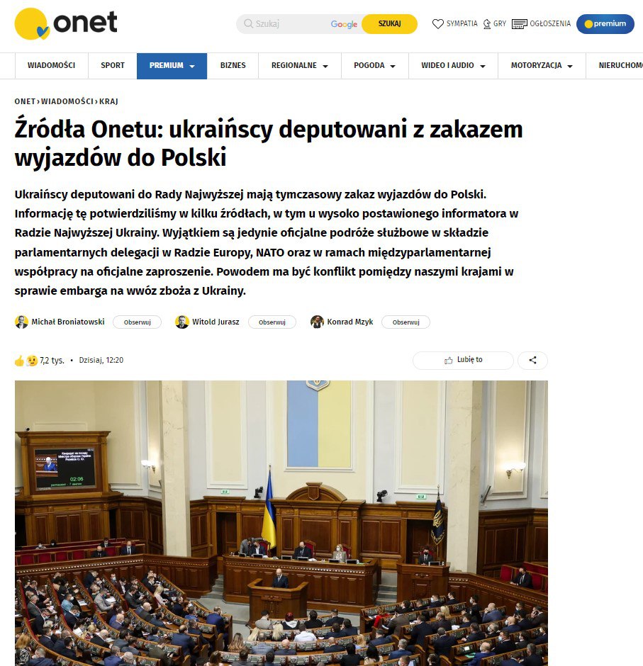 Onet: депутатам Верховной Рады Украины временно запрещен выезд в Польшу.