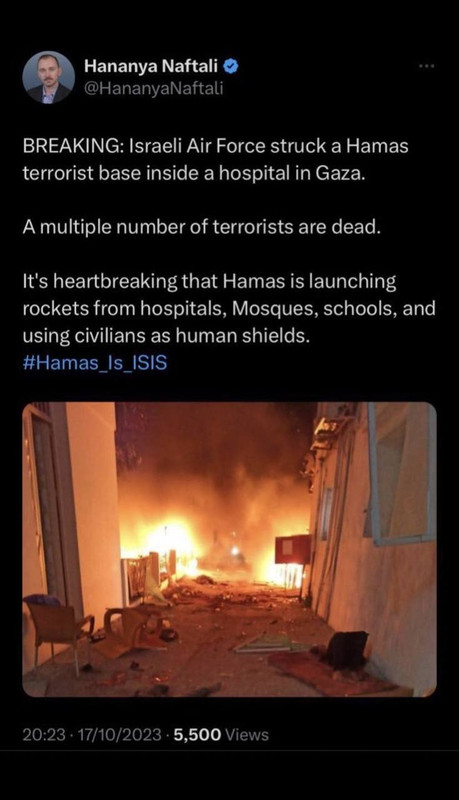 Представитель израильского подразделения Digital Units сначала сделал заявление, подтверждающее, что израильские самолеты нанесли удар по больнице в Газе, и сообщил, что многие террористы были убиты, а затем удалил свой твит.