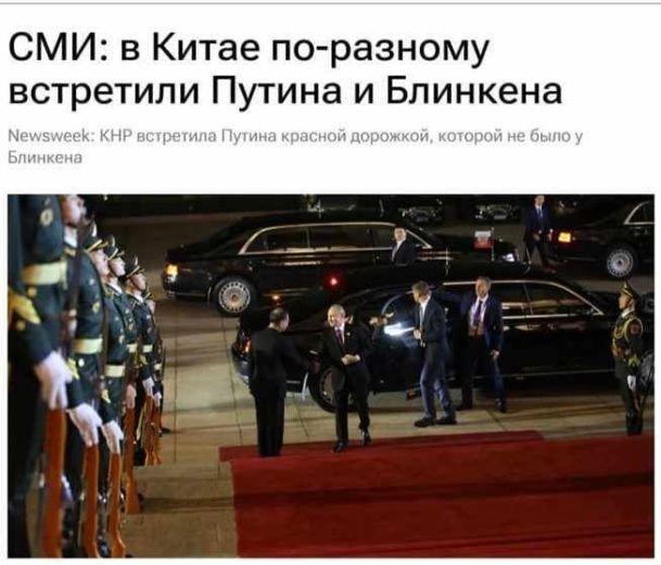 «Китай встретил президента России Владимира Путина с “красной дорожкой”, которой не было у госсекретаря США Энтони Блинкена в июне, сообщает издание Newsweek.”Прибытие (президента России) Владимира Путина в Пекин прошло с “красной дорожкой”, которой не было у Энтони Блинкена во время визита госсекретаря США в Китай в июне”, – пишет издание. По данным издания, прием госсекретаря США в июне охарактеризовали, как довольно сдержанный.»