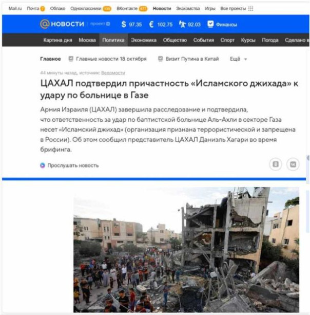 «ЦАХАЛ подтвердил причастность «Исламского джихада» (организация признана террористической и запрещена в России) к удару по больнице в Газе. Армия Израиля (ЦАХАЛ) завершила расследование и подтвердила, что ответственность за удар по баптистской больнице Аль-Ахли в секторе Газа несет «Исламский джихад». Об этом сообщил представитель ЦАХАЛ Даниэль Хагари во время брифинга.»