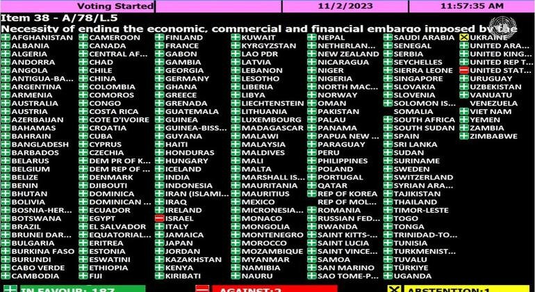 Генеральная Ассамблея ООН (ГА ООН) в 31-й раз подряд призывает Соединенные Штаты прекратить свое многолетнее торговое эмбарго против Кубы. Голосование по резолюции на Генеральной Ассамблее, состоящей из 193 членов, установило рекорд поддержки Острова Свободы: не имеющую обязательной силы резолюцию одобрили 187 стран, США и Израиль выступили против, Украина воздержалась. Сомали, Венесуэла и Молдова не голосовали.