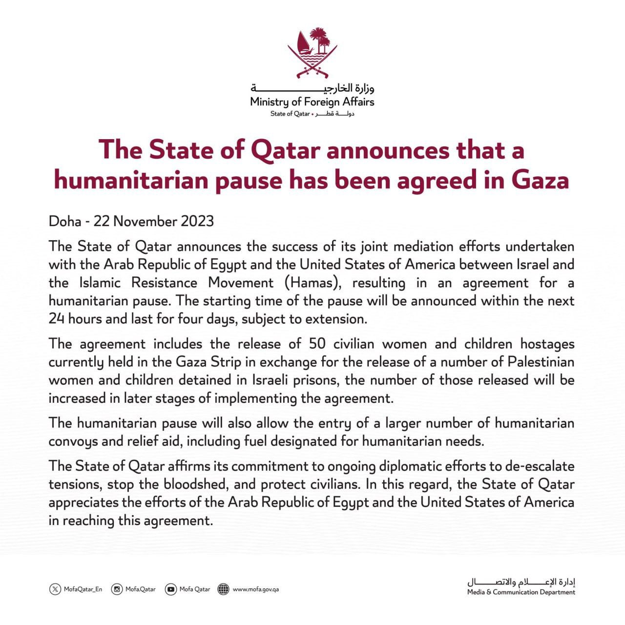 В материале сказано, что договорённость включает в себя такие положения, как освобождение 50 израильских заложников из сектора Газа в обмен на 150 палестинских заключённых, которые находятся в тюрьмах Израиля.