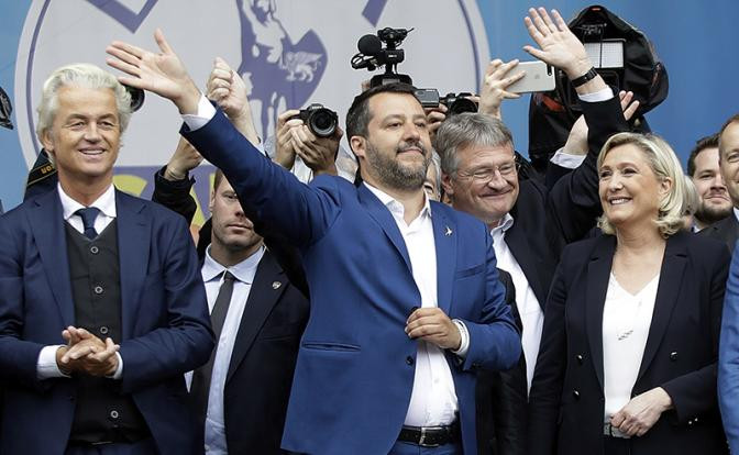 На фото: лидер голландской Партии свободы Герт Вилдерс, вице-премьер Италии, партии «Лига Севера» Маттео Сальвини, один из лидеров партии «Альтернатива для Германии» Йорг Меутен и глава французской партии «Национальное объединение» Марин Ле Пен