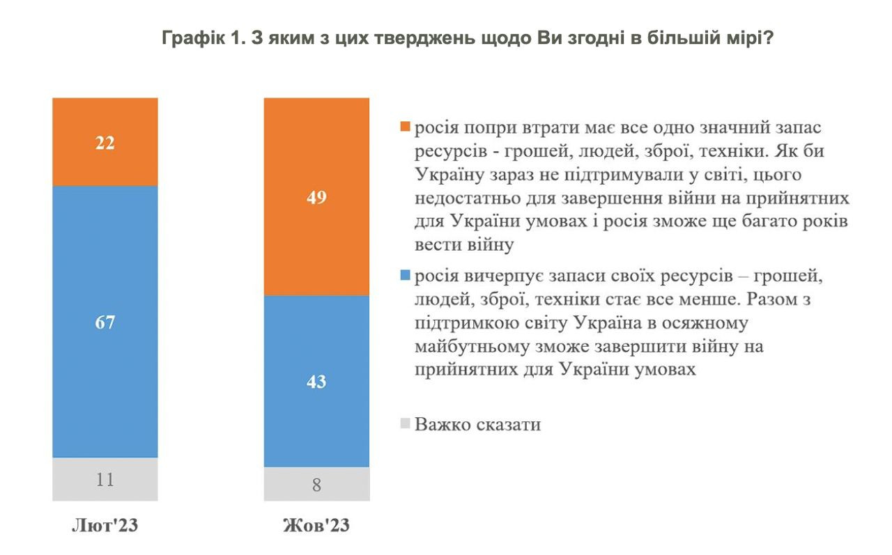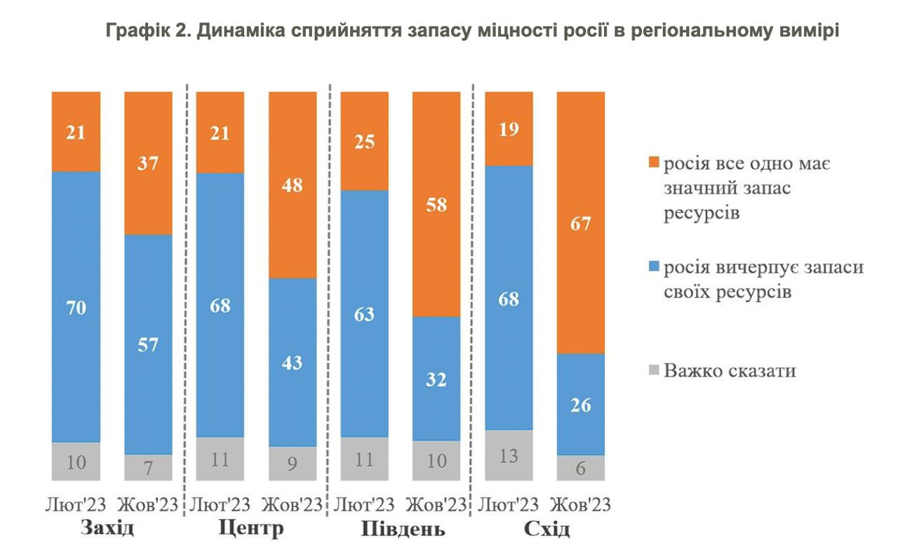 При этом в истощение России больше всего верят те, кто живёт далеко от войны и видит её в основном по телевизору – Западная Украина (57%) и Центральная Украина (43%). На юге и востоке страны таких всего 32% и 26% соответственно.