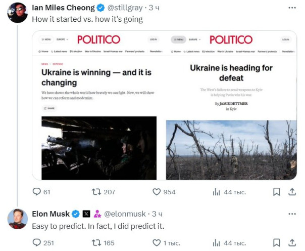 «Это легко было предсказать. На самом деле, я это предсказал», — написал Маск в X (Twitter), комментируя пост одного из пользователей, выложившего картинку с двумя статьями газеты Politico о конфликте на Украине.