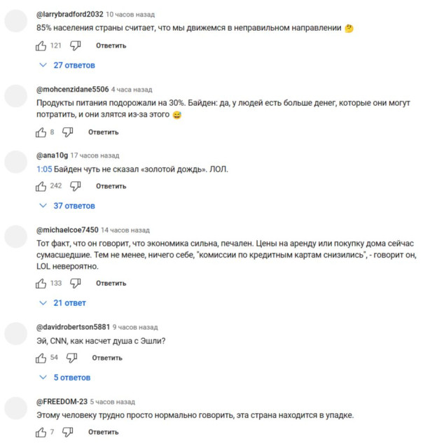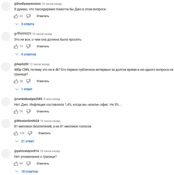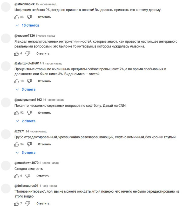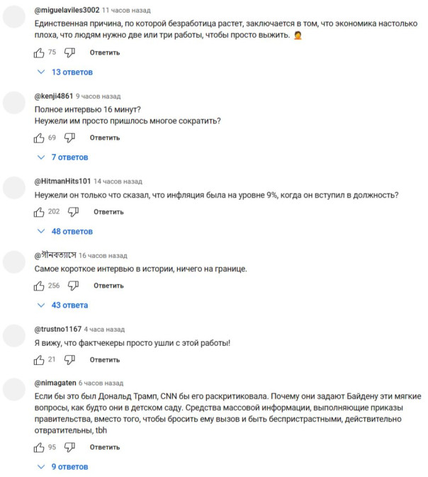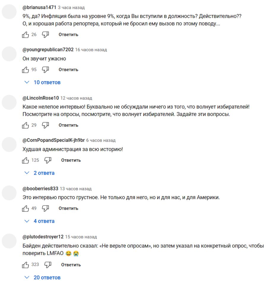 Вчера президент США Джо Байден дал интервью CNN. За 6 месяцев до выборов, Байден дал свое худшее интервью. Рассказывать о нем не имеет смысла, предлагаю почитать комментарии (переведены автоматом) под видео CNN, сразу всё станет понятно.