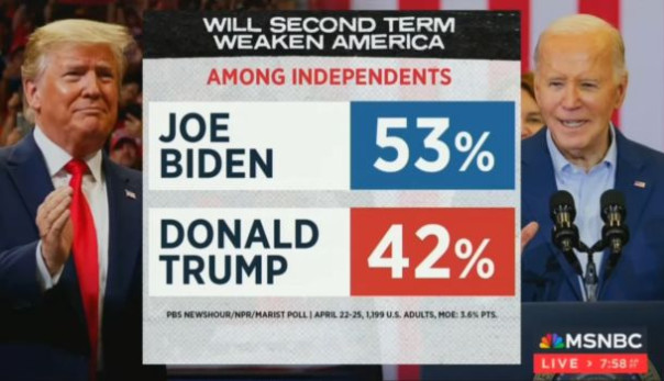 Последней картинкой - результат опроса независимых избирателей по вопросу "Чей второй срок сделает США слабее?", Байден - 53%, Трамп - 42%. Источник