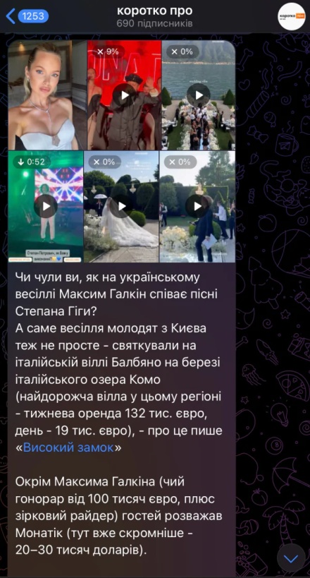 В интернете распространились фото и видео с пышной свадьбы украинцев на вилле, расположенной у итальянского озера Комо. Ведущим выступил бывший российский шоумен Максим Галкин (признан Минюстом РФ иноагентом). Он пел украинские песни, в частности, песню Софии Ротару «Одна калина», Любомира Якима «Ой, смереко» и «Золото Карпат» Степана Гиги.