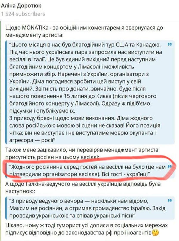 Доротюк обратилась за официальным комментарием к менеджменту Монатика, на что получила ответ, что украинский артист выступил на свадьбе в свой выходной день во время благотворительного тура.
