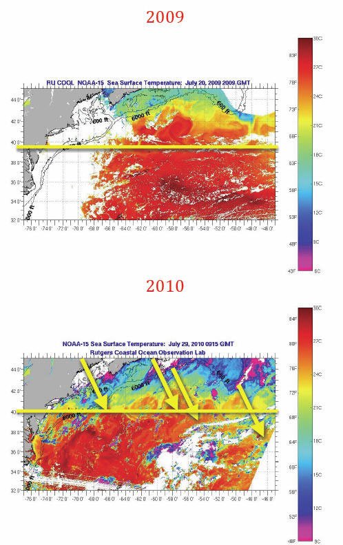 По спутниковым данным от 22.08.2010г видно, что средняя температура воды на севере Гольфстрима упала на 10 градусов по Цельсию по сравнению с докатастрофным 2009 годом. Ленточный конвейер разбился на отдельные участки и перестал переносить к Европе тёплую воду. Доктор Zangari утверждает: «Они убили кардиостимулятор мирового климата на планете»