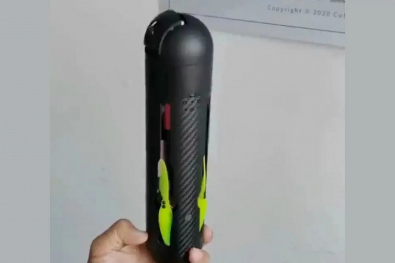 Его массогабаритные характеристики весьма скромны: пластиковый цилиндрический корпус массой 600 граммов имеет диаметр 50−70 и высоту порядка 250−300 миллиметров. Лучи винтомоторных групп, трансформирующиеся в рабочем положении в Х-образную структуру, размещены в четырех продольных выемках в боковой поверхности цилиндра.