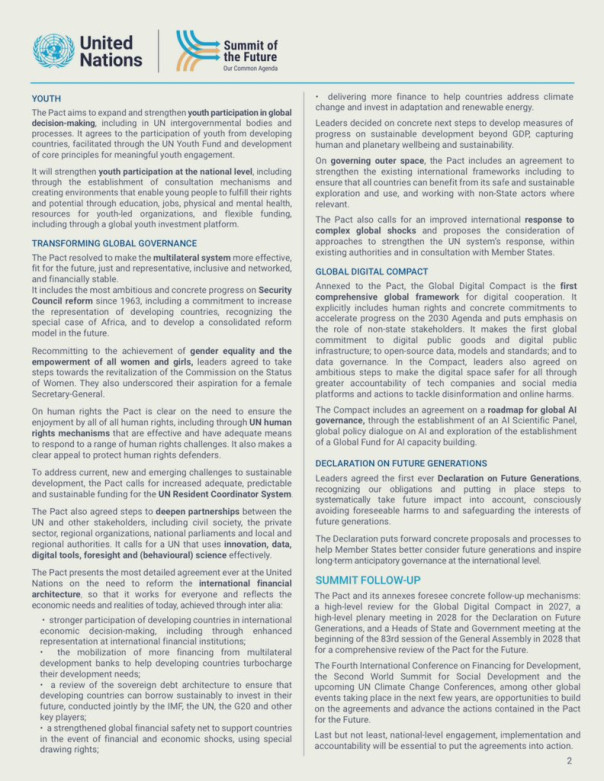 Предваряя его принятие, Генеральный секретарь ООН Антониу Гутерриш заявил, что речь идёт об «эпохальной декларации», обязывающей принять меры по улучшению мира для будущих поколений.