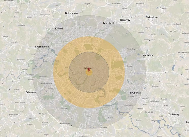 Американский журнал Newsweek описал последствия гипотетического удара США термоядерной авиабомбой B83 мощностью до 1,2 Мт по Москве, Пхеньяну и Пекину. Судя по опубликованной карте поражения взрывная волна достанет даже до Одинцово, Химок, Мытищ, Балашихи и Люберец.