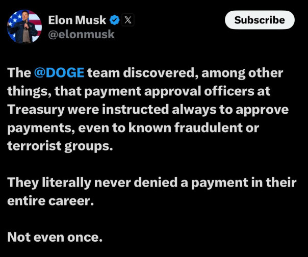 "[Команда Департамента эффективности правительства США] DOGE обнаружила среди прочего, что должностные лица ответственные за одобрение платежей в Министерстве финансов были проинструктированы всегда проводить платежи, даже в случае если известно, что [контрагенты] мошеннические или террористические группы.