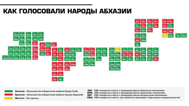 Кстати, согласно опросам различных социологических служб, именно победивший в первом туре кандидат Бадра Гунба, сумел заручиться широкой поддержкой представителей всех национальностей республики – абхазов, армян, русских – в том числе на таких сложных участках, как традиционно протестный Сухум, где он получил 43 % голосов.