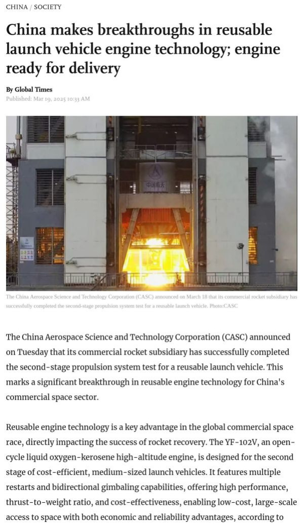 Китай успешно испытал двигатели для второй ступени возвращаемой ракеты.