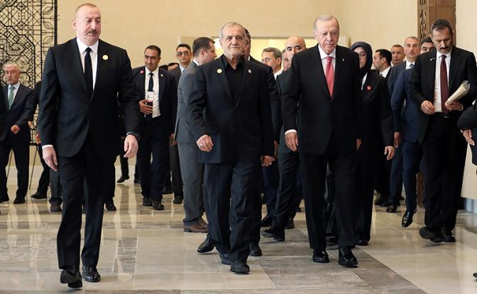 На фото: президент Турции Реджеп Тайип Эрдоган, президент Азербайджана Ильхам Алиев и президент Ирана Масуд Пезешкиан принимают участие в 17-м саммите Организации экономического сотрудничества