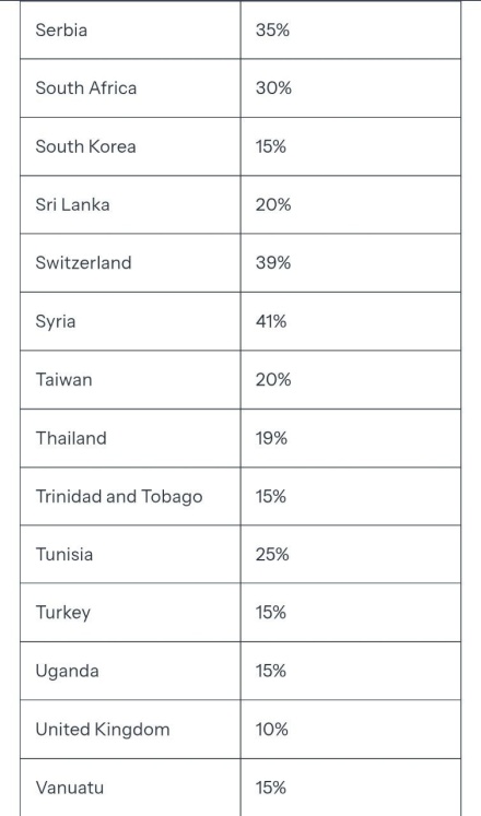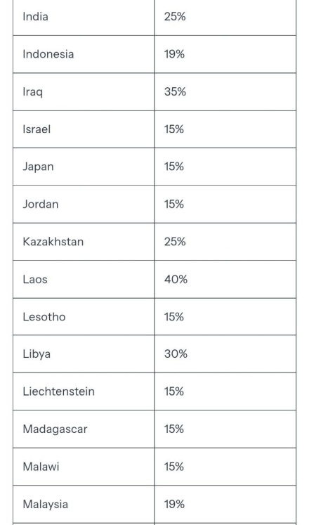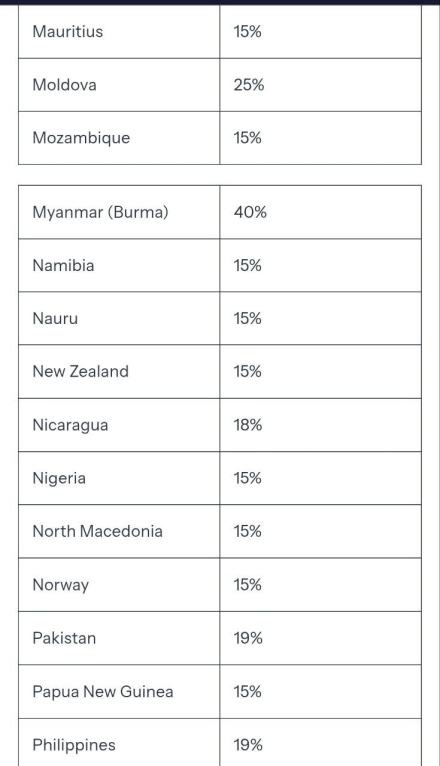Согласно опубликованному Белым домом списку стран и территорий и установленных в их отношении пошлин, наиболее высокие ставки будут приняты против Сирии (41%), Лаоса, Мьянмы (40%), Швейцарии (39%) Ирака, Сербии (35%), Алжира, Боснии и Герцеговины, Ливии и ЮАР (30%).