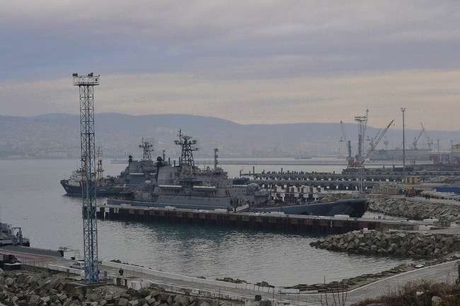 В порту Новороссийска загружают бронетехнику в десантные корабли следующие в Сирию. У причалов Новороссийской военно-морской базы находятся два больших десантных корабля (БДК) "Калининград" и "Минск" Балтийского флота (БФ).