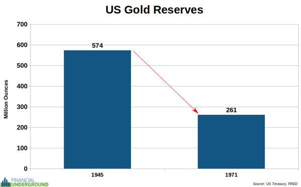 С момента окончания Второй мировой войны до 1971 года золотой запас США сократился более чем наполовину — с 574 миллионов тройских унций до примерно 261 миллиона.