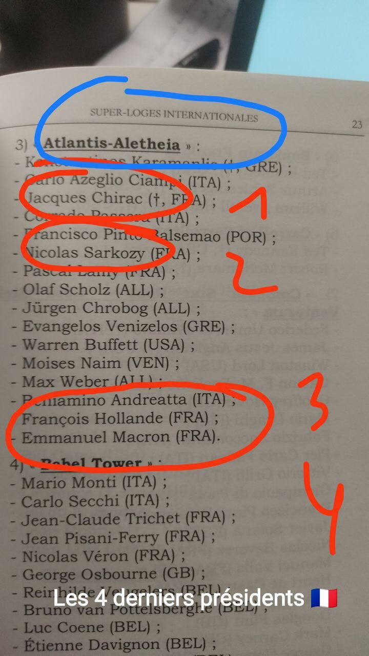 "Эммануэль Макрон является идеальной преемницей Олланда... уже будучи банкиром Ротшильдов, он был консультантом, а затем министром того же Олланда. Кроме того, он является любимцем[любовником по вызову] масона Жака Аттали… Лично Макрон хвастается своим масонским членством в Ur-lodge (суперложа) "зеленое братство", куда его привел Олланд, и в суперложе "Атлантида Алетейя"… Его наставник Аттали, утонченный масон, выдающийся интеллектуал, который работал на левоцентристов и участвовал в строительстве этой технократической и олигархической Европы... косметическая операция, которая привела Макрона в Елисейский дворец"