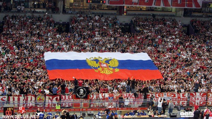 Фанаты сербской баскетбольной команды «Црвена Звезда» во время матча с украинскими спортсменами из «Будивельника» растянули огромный флаг России и спели «Катюшу». Сербы одержали победу со счётом 79:70.