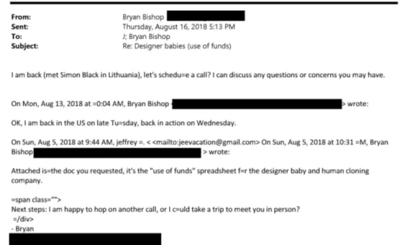 Ещё один сногсшибательный документ из кейса Минюста США гласит: Эпштейн вел оживленную переписку с генным инженером Брайаном Бишопом, который пытался собрать средства на поддержку проекта по созданию «дизайнерских» ГМО-детей в биолаборатории на Украине.