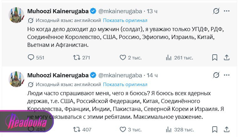 В дополнение Кайнеругаба признался, что боится ядерных держав, в том числе Россию. В конце марта он в очередной серии постов утверждал, что на захват Тегерана Уганде потребуется не больше двух недель. Источник