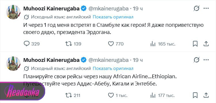 Старший сын президента Уганды Йовери Мусевени и по совместительству главнокомандующий армией страны Мухузи Кайнеругабы выдал серию провокационных постов. В них он пригрозил разорвать дипотношения с Турцией в течение 30 дней, если Анкара не решит спорные вопросы. В дополнение он потребовал «самую красивую женщину Турции» себе в жены.
