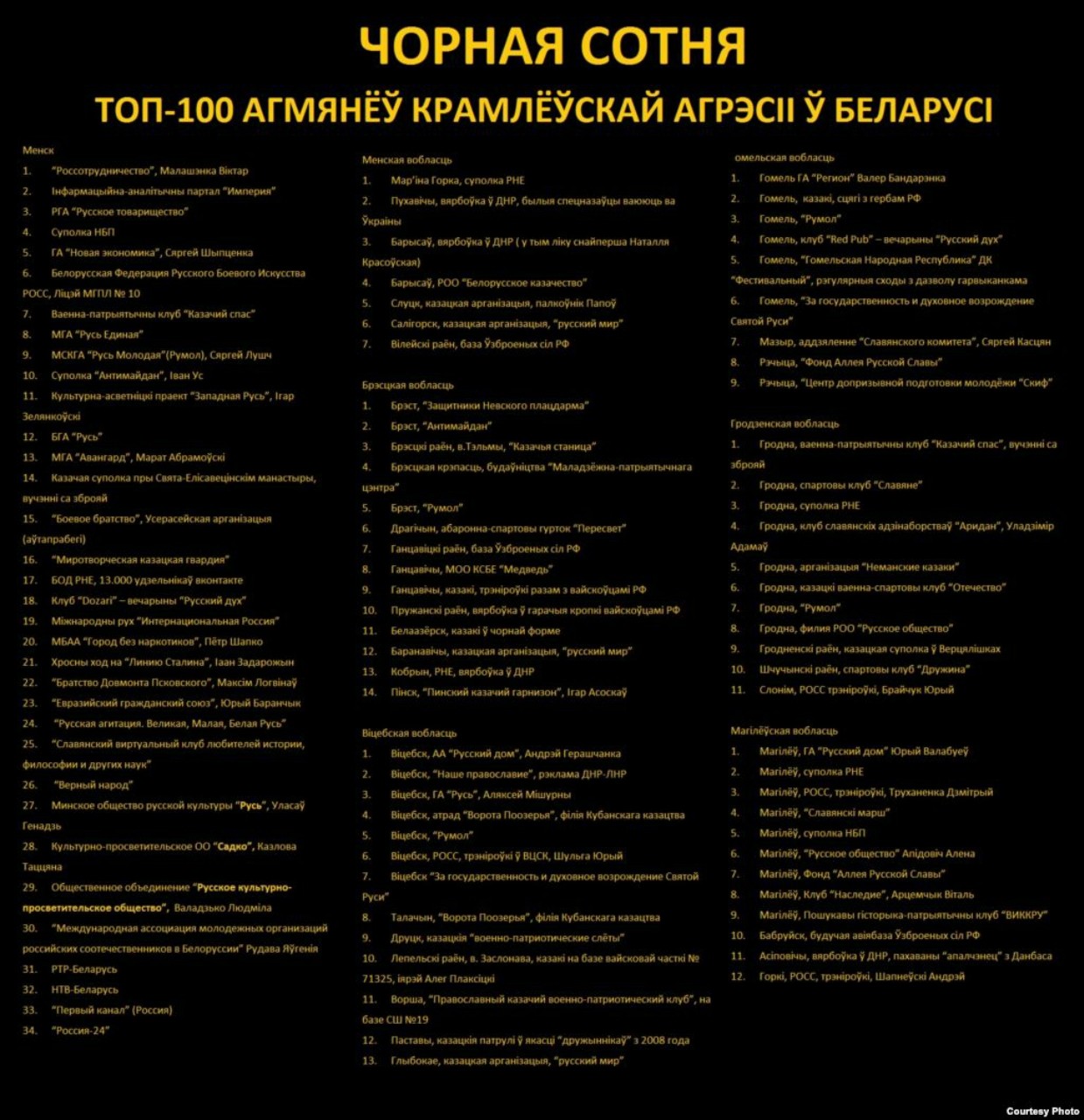 Стараясь произвести впечатление на общество, белорусские националисты всё шире используют опыт «украинских коллег» по созданию списков «врагов нации». Довольно широкую известность получил в республике список «Чёрная сотня». Это опубликованный на сайте националистического «Молодого фронта» перечень 100 «пророссийских» организаций, которые якобы способствуют «российской оккупации Белоруссии». В публикации указывалось, что вошедшие в список организации – это «сто очагов кремлёвской агрессии в Белоруссии».