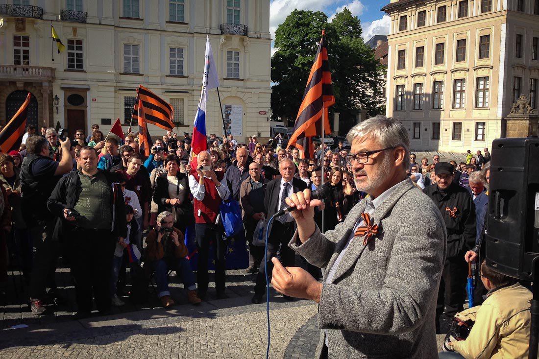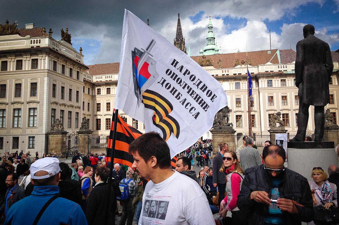 08.05.2014, Чехия | Сегодня в Праге у президентского дворца известный чешский юрист и бывший сенатор от Чешской социал- демократической партии Иржи Вывадил и его коллеги из группы «Друзья России в Чешской республике» провели акцию в поддержку действий российских властей на юго-востоке Украины, против фашизма и за федерализацию. На площади у дворца собрались около 200 человек, среди которых были российские и чешские граждане. Собравшиеся обвинили США и Европу в разжигании конфликта на юго-востоке Украины.