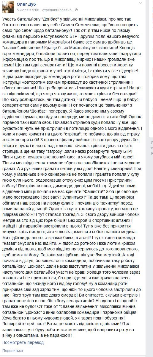 И вот началось это "освобождение" с батальоном "Донбасс" впереди. Я шел уверенным в своем отделении и думал, что, идя впереди, мы не дадим случиться беде! Однако паранойя таки взяла свое. Началась стрельба куда попало и во все, что движется! Чуть не пристрелили в затылок одного из моего отделения. И когда я начал кричать на этого "стрелка", то увидел, что он от страха совсем не при себе! С правого фланга вышел со своего двора дедушка без ничего в руках и у него над головой начало стрелять где-то пять стрелков, а еще на такую "угрозу" дали приказ развернуть пушку БТР! После этого начался уже полный хаос, в котором потерялся мой голос! Только мое отделение держало оружие на предохранителях и не витягувало гранат. А из рук других гранаты летели во все дыры! Даже в свинарник! При чем, в маленькое окно свинарника не попали и граната угодила в кучу навоза возле него, обдрискавши окружающих этим навозом! Пристрелили собаку! Постреляли окна, дымоходы, двери, мебель и т.д. Уходя за нами отделение милиции начали на нас кричать "Фашисты!" Разве это село еще мало пострадало и без вас?! Остановитесь!" Да где там! Эти параноики обогнали наш взвод на левом фланге и начали эту "зачистку" перед нами на нашем участке! Один из-за угла так бросил гранату, что чуть не взорвал своего же! И здесь произошла трагедия. Со своего двора вышел человек метров за сто от этих горе-бойцов! Без оружия! В спортивных штанах и майке! И эти параноики выстрелили в него! Здесь я уже без прикрытия бросился сквозь них к этому мужчине, взяв с собой нашего медика. Мы подбежали к нему, а он уже бился в агонии! И здесь істошна команда "назад" заставила нас отойти. Я подбежал к ротному и уже яростным криком добился от него, чтобы мое отделение вернулось к тому раненому, чтобы помочь ему. И когда мы подбежали, он был уже мертв. А тогда началось отступление, потому что вышестоящие командиры, увидев такую работу батальона "Донбасс", дали приказ отступать! В освобождении Николаевки следующего дня батальон не участвовал! Убийца того мужчины сейчас скрывается и не признается, потому что при отступлении я уже кричал на весь батальон, что найду его и оторву голову! Ну а командир роты прикрывает свой зад сейчас тем, что будто-то этого мужчину застрелили в нас и его труп там уже долго вонял! Вы спросите, сколько выстрелов и гранат полетело в нашу сторону со стороны сепаратистов? Ни одного и ни одной! Их там уже не было! Вот такое вот "славное освобождение" Николаевки совершил батальон "Донбасс" по вине балаболів командиров и параноиков бойцов! Хотя много в нем замечательных людей, которые сейчас полны возмущения! Распространяйте этот пост! Потому что за это должны ответить эти ничтожества! Я же остаюсь здесь и буду делать все возможное, чтобы направить роту на войну с бандитами, а не паранойю!!!