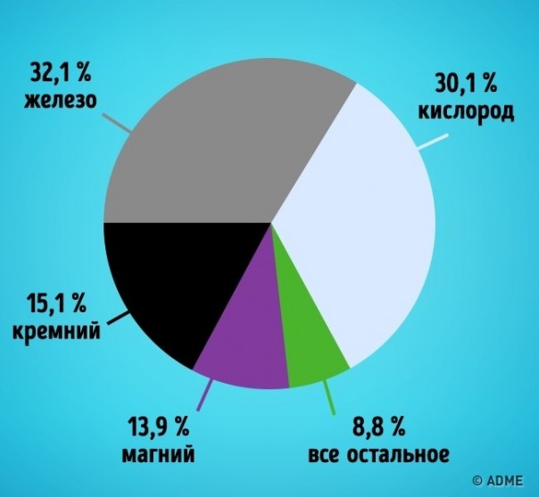 Если бы мы захотели разделить планету по составу, то выглядело бы это так: 32,1 % — железо, 30,1 % — кислород, 15,1% — кремний и 13,9 % — магний. Считается, что большая часть железа (около 90 %) находится в ядре. А кислорода больше всего в земной коре (около 47 %).