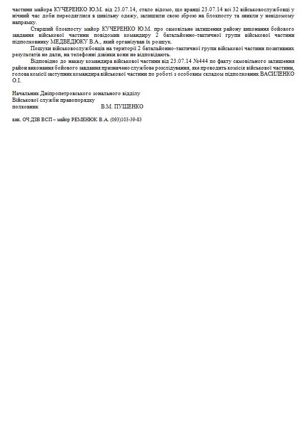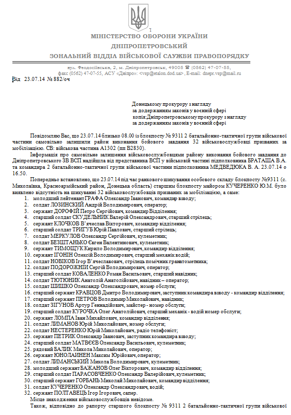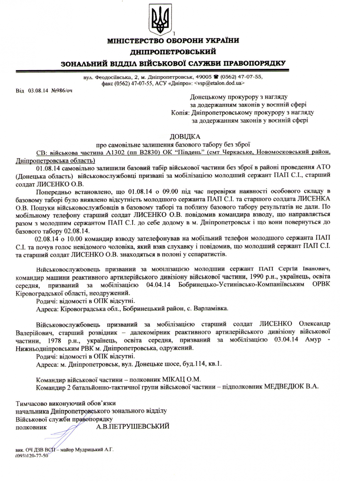 Мы продолжаем находиться внутри информационных ресурсов Днепропетровского зонального отдела войсковой службы правопорядка. Мы видим, что замена полковника В.М. Пушенко на полковника А.В.Петрушевского никак не помогла хунте. "Защитники" Украины по-прежнему полностью деморализованы. Непонимание цели своего пребывания в зоне боев, постоянный страх за свою жизнь и угроза окружения, из которого командование не поможет выйти, морально истощают солдат. Они продолжают гибнуть, получать ранения и бежать, бросая военную технику и оружие.