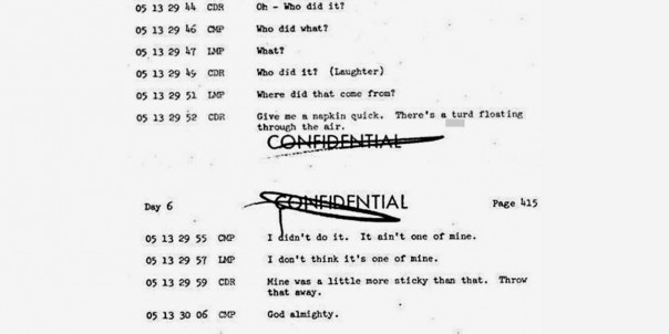 Раньше американские астронавты пользовались в полёте специальными пакетами, которые прикреплялись к нужному месту, когда требовалось справить нужду. И время от времени случались конфузы. Вот расшифровка переговоров астронавтов одной из миссий «Джемини», где они азартно определяют, чьё именно дерьмо плавает по кабине космического корабля.