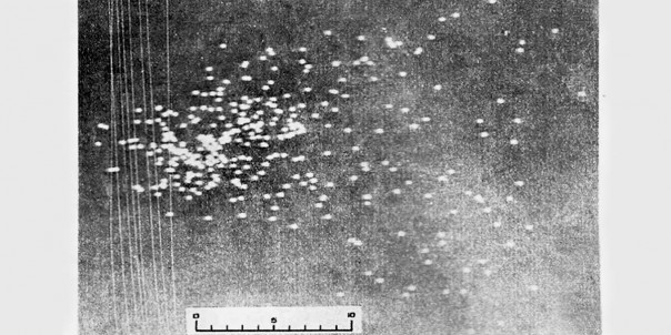 Фото из старого журнала «Охота и охотничье хозяйство»: теневая фотография дробового заряда в 6 м от дульного среза ствола после выстрела из ствола с цилиндрическим каналом