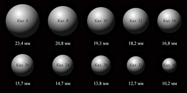 А если отлить из того же фунта свинца побольше пуль (скажем, 16) — то диаметр их будет меньше. А если 20 — ещё меньше. И так далее. Именно поэтому 12-й калибр больше 16-го. Вот вам для наглядности табличка: