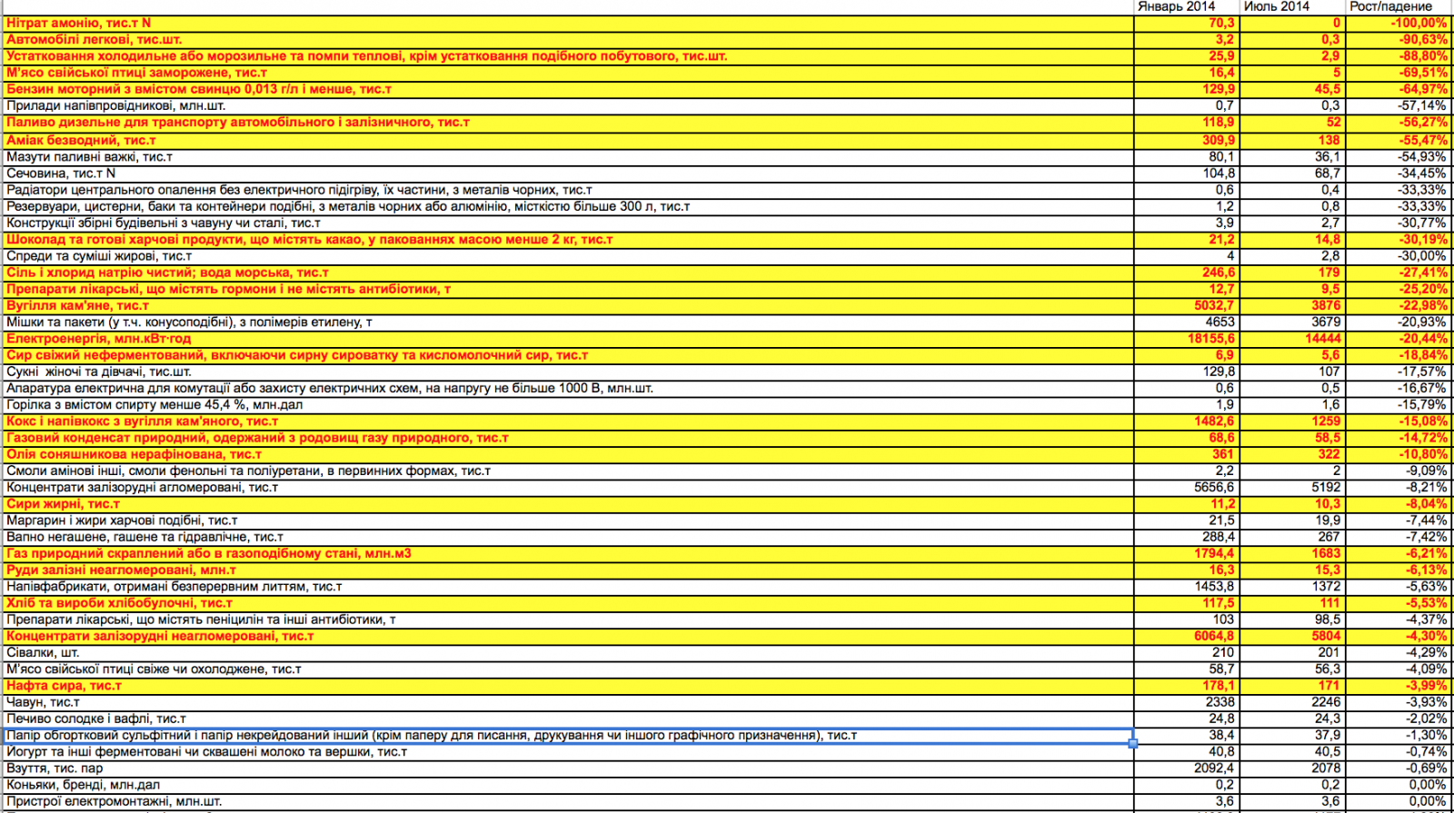 Особо хочется выделить падение производства продуктов питания: производство мяса птицы упало на 70%, шоколада и готового продовольствия - на 30%, сыра - на 19%, хлеба на 6%, соевого масла на 11%, водки на 16% свидетельствует о глубочайшем кризисе потребления.